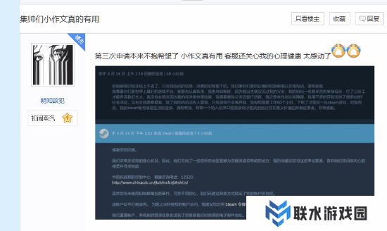 近日,一位ID为明知故犯的玩家在Steam吧分享趣事。自己在向Steam客服申诉时,自称是抑郁症患者,并写了一篇小作文来“诉苦”,请求客服能帮他找回Steam账号。而客服竟然真的帮他解决了问题,还关心他的心理健康。