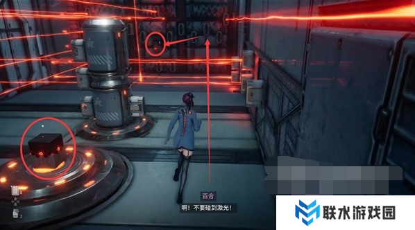 2、但是注意开这个小盒子得服装设计图有难度,需在激光刚出现时,迅速跳过去按按钮关闭激光。