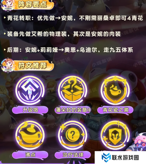 安妮的装备传统肉装3件套强度最高,铲子法师、物理阵容都是55开,因此荆棘之甲和巨龙之爪都可以做,如果做石像鬼石板甲,则考虑狂徒铠甲+巨龙之爪的搭配,物理阵容多则做荆棘之甲。
