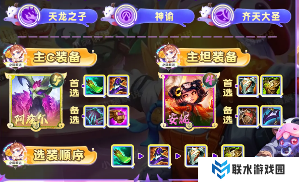 前期用2星莉莉娅打工,中后期替换2星沙皇,阵容只有4神谕,尽量补一个启动装:青龙刀>适应性头盔=蓝霸服,其他装备优先高输出为主,帽子、法爆优先级最高,鬼书、大天使备用。