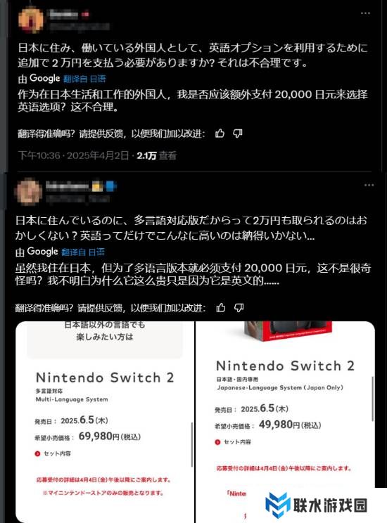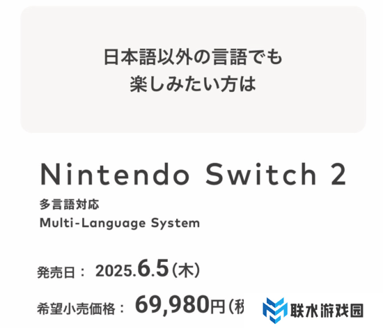 直面会上公布,Switch2日版售价为49980日元(约合人民币2429元),仅支持与“国家/地区”设为“日本”的任天堂账号绑定,并且主机系统语言只能设为日语。而如果想使用其他语种,则需要多花20000日元,购买售价为69980元的多语言版本。(约合人民币3401元)