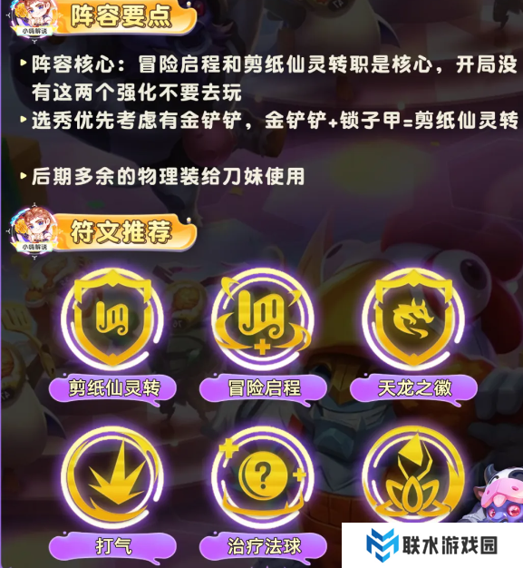 其次开局是否有剪纸仙灵转职是能玩的关键,有转职不刚需刀妹就能够开出7剪纸,后续9人口补充5费卡提高中后期上限,没有转职容易老八