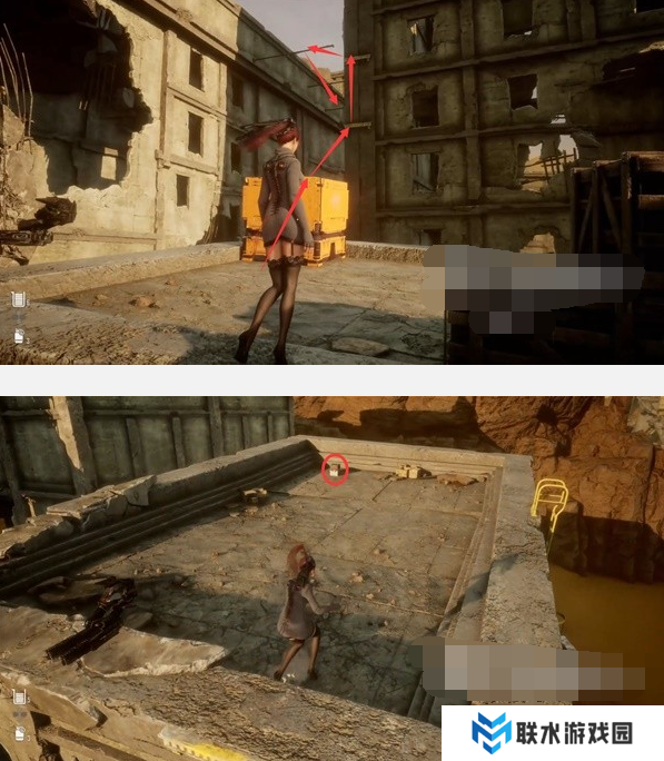 从沙漠的下图位置上楼顶,一路跳跃遇到个小机器人,最后到一个房顶上开小盒子,得到【服装】设计图:墨色波浪。