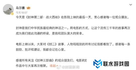 导演乌尔善发文,表示衷心感谢每一位观众朋友。电影上映以来,大家对电影故事、人物和视效的所有讨论自己都看到了,感谢每一条鼓励、批评和建议。期待在未来的作品中与大家再次相聚。