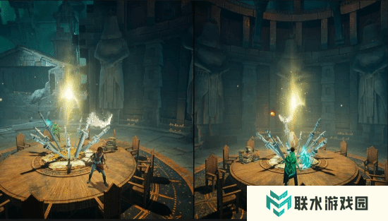 可以看到,《双影奇境》几乎1:1复刻了《艾尔登法环》中的圆桌厅堂,一簇耀眼的光芒点亮了桌子上的剑丛,几尊巨大的石像屹立在四周。有网友调侃道,Zoe能在记忆中如此精确的还原出这一场景,说明她在构思小说时玩了太长时间的《艾尔登法环》。