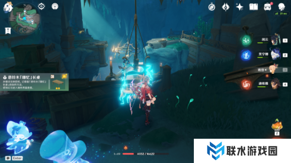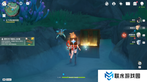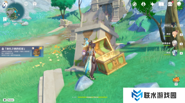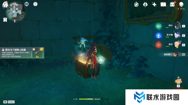 该处位置最东有乐章,拿了乐章,沿着墙壁向上走,可以看到一个有闪光点的石像,靠近挖掘出现奇馈宝箱。(调查给一二星圣遗物。)