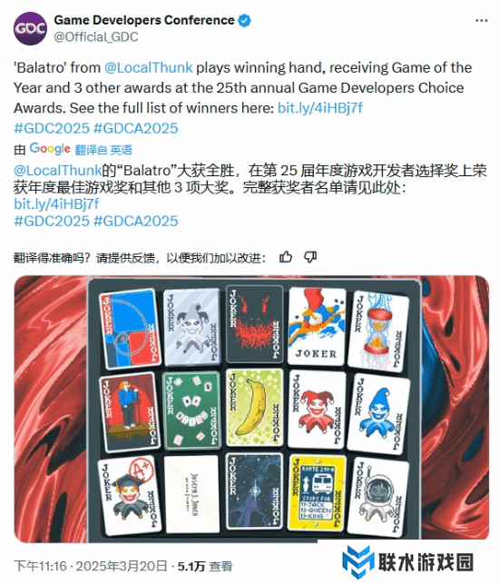 《小丑牌》在GDC上斩获了四项游戏大奖,包括年度最佳游戏奖、最佳出道作奖、最佳设计奖及创新奖四个重要奖项,获得了评审的高度认可。然而,尽管作者本人LocalThunk确实到场参与GDC,但他却一如往常,并没有登台领奖。
