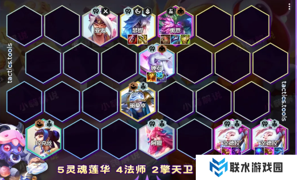 阵容理解:不刚需7灵魂莲华,不需要厄斐琉斯开7莲华,中后期2个辛德拉+5灵魂4法师强度最佳