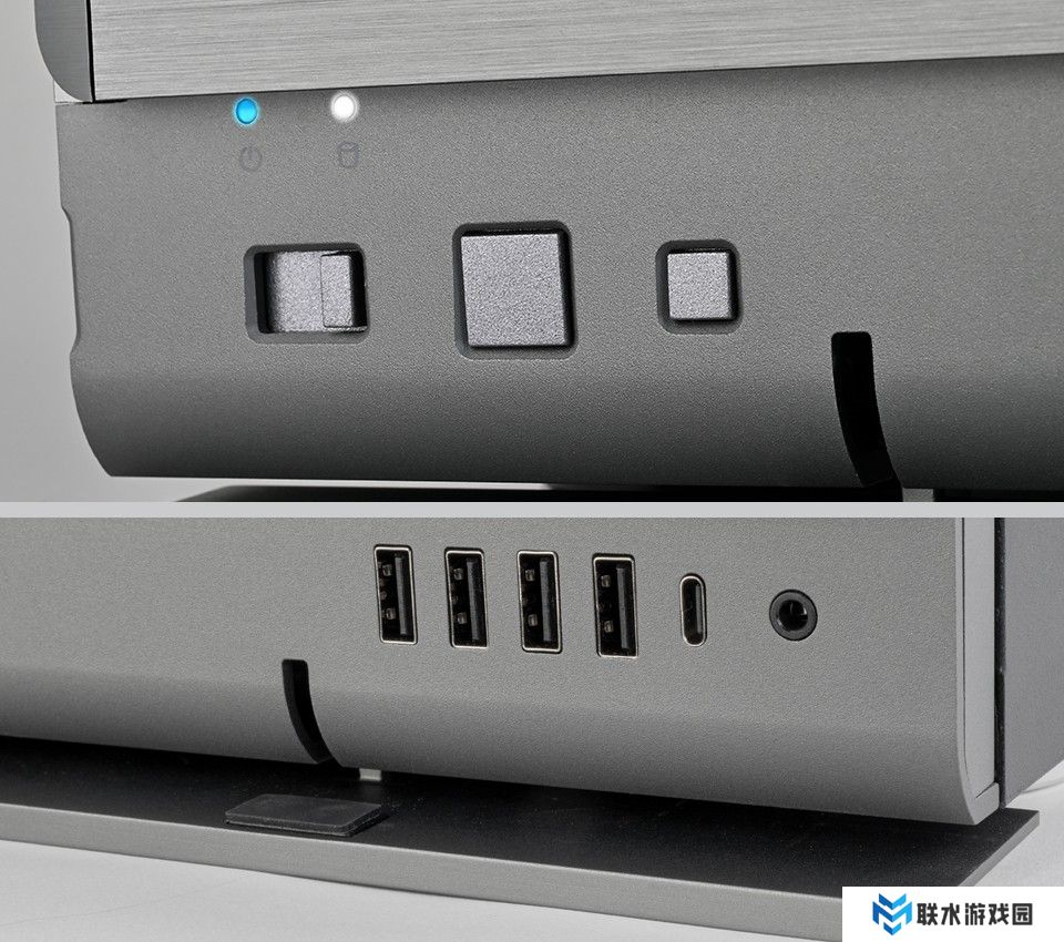 Crown 04 机箱的前置 I/O 面板位于正面下方滑动式盖板的右侧,提供了 1 个 USB-C、4 个 USB-A 5Gbps 和 1 个二合一音频插孔;这一盖板的左侧则包含可调式的 LED 指示灯、开机键等元素。