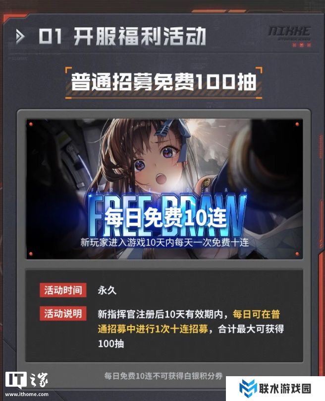 新指挥官注册后首 10 天,每日可在普通招募中进行 1 次十连招募,合计最大可获得 100 连!