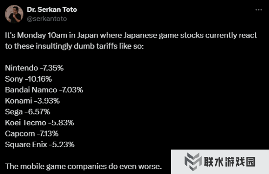 据行业分析师Serkan Toto博士消息,由于美国**近期在商品经济政策上的一些调整,导致东京股市上的多家日本主流游戏公司股价大幅下挫。其中,索尼股价下跌10%,任天堂下跌超7%。