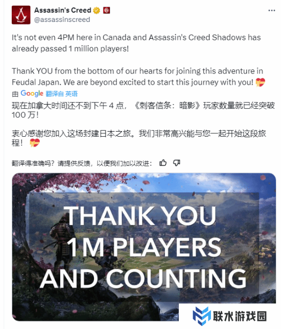 育碧官方宣布,《刺客信条:影》玩家数量已突破100万。