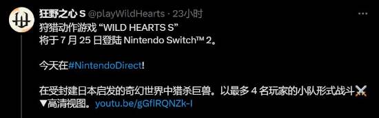 光荣特库摩宣布,《狂野之心》将推出加强版《狂野之心S》,于7月25日登陆Switch2。NS2版新增四人联机模式,可以合作出击也能单打独斗。