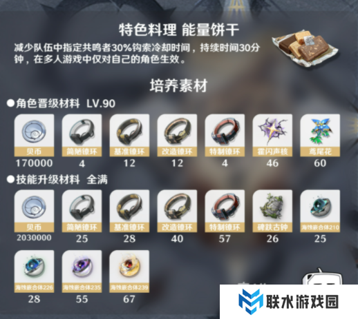 【能量饼干】:提减少队伍中指定共鸣者30%钩索冷却时间,持续时间30分钟,在多人游戏中仅对自己的角色生效。