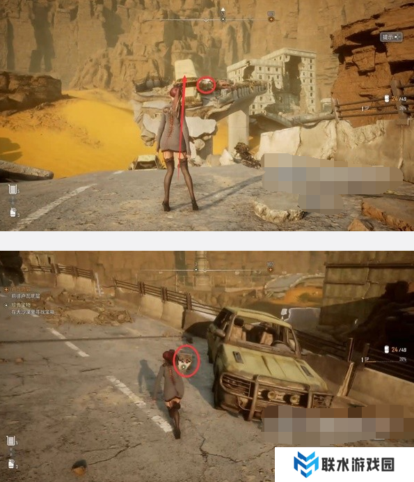 委托“珍贵宝物”,到沙漠的指定位置。射爆油桶,汽车就会掉下来搭成桥,然后过去开小盒子得到【服装】碧蓝季风。