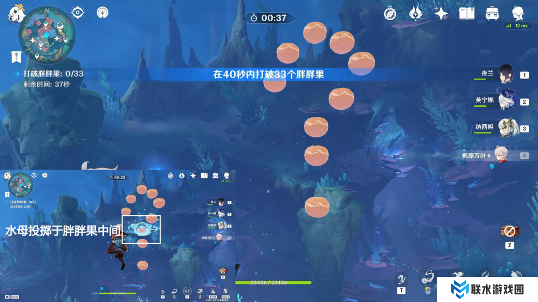 限时挑战:在40秒内打破33个胖胖果;(将水母投掷于胖胖果中间引爆3次即可)