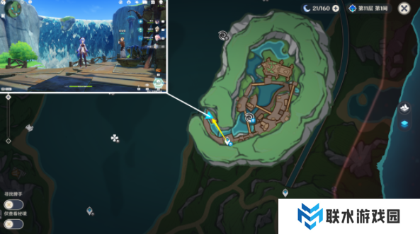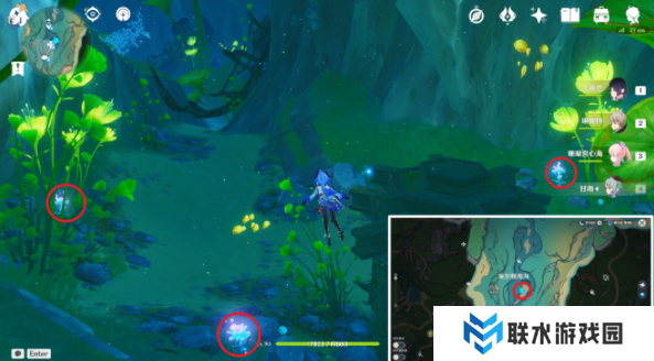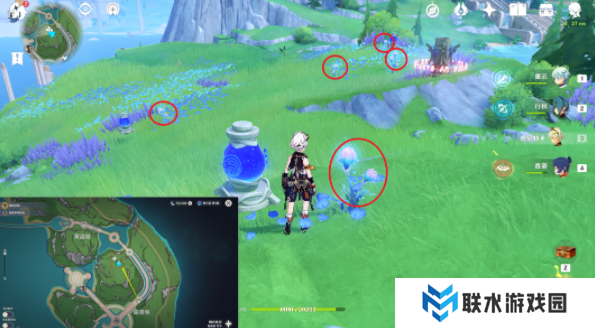 从枫丹廷正上方的传送点出发,沿沙滩边缘采集完五个海露花后(在陆地上的用水元素攻击后才可以采集),朝向东南方入水采集水下部分。