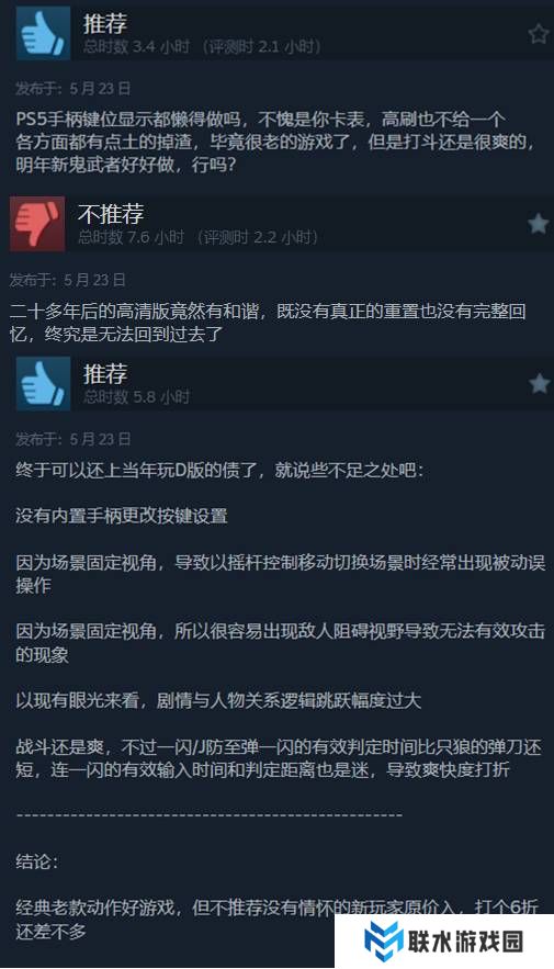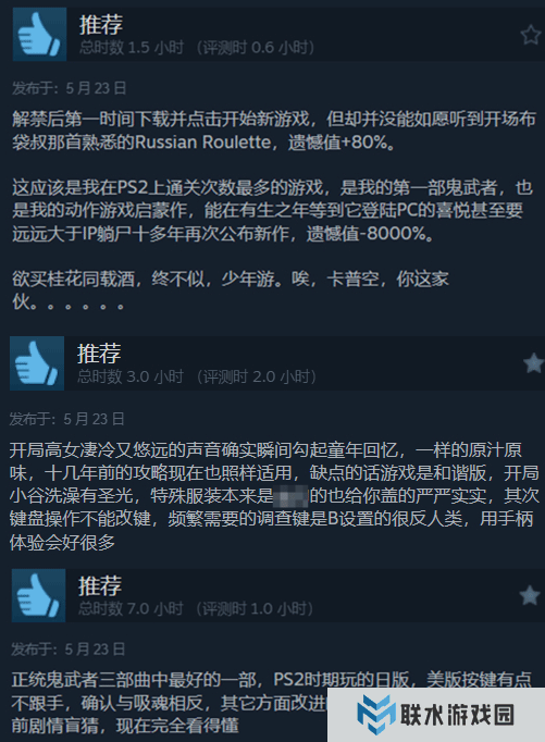 部分给出评价的玩家表示,《鬼武者2》是一款非常经典的游戏,高清复刻版的素质也是相当出色,战斗非常爽,但游戏在某些桥段里有“圣光”和谐,影响了游玩兴趣。除此之外,《鬼武者2》高清复刻版没有内置手柄更改按键设置。