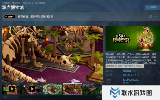 由双点工作室制作,世嘉发行的《双点博物馆》即将正式发售,游戏曾获得了IGN 9分的超高评价,我站也为其打出了8.4分的高分评价,认为《双点博物馆》就像一个老朋友,玩家不用担心他会变成别的样子,也会期待和他的下一次重逢。购买探索者版的玩家已可提前进行游玩,截至发稿前,《双点博物馆》在Steam平台的评价为“特别好评”,723篇玩家评测中有96%为好评。