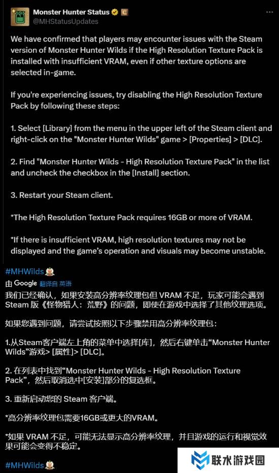 今天,《怪猎》官方在推特发文称,目前团队已经确认,如果在显存不足的情况下安装高分辨率材质包,即使玩家在游戏内选择了其他材质选项,仍可能导致Steam版《怪物猎人:荒野》出现运行问题。