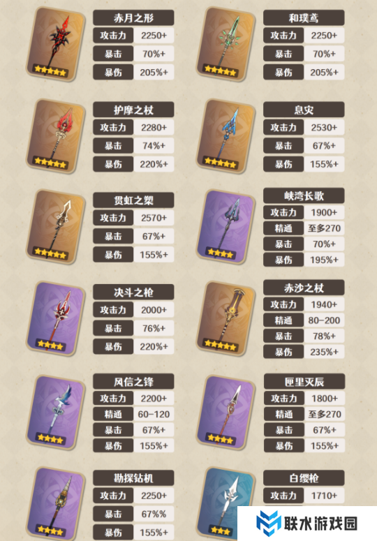 10、【白缨枪】宝箱获取。提供暴击率和普攻加伤,新手前期首选。适配阿蕾奇诺绝大多数队伍。