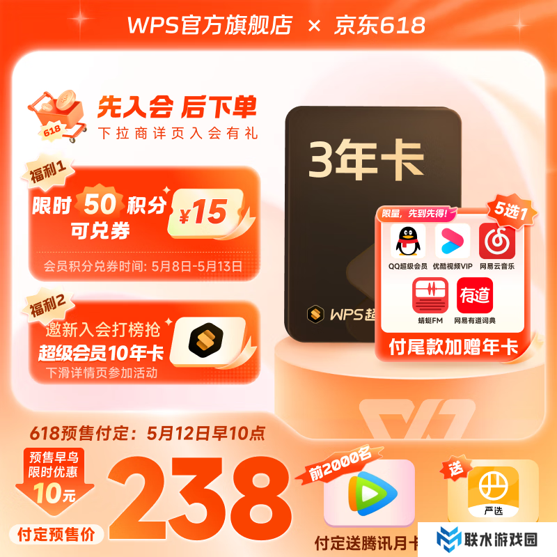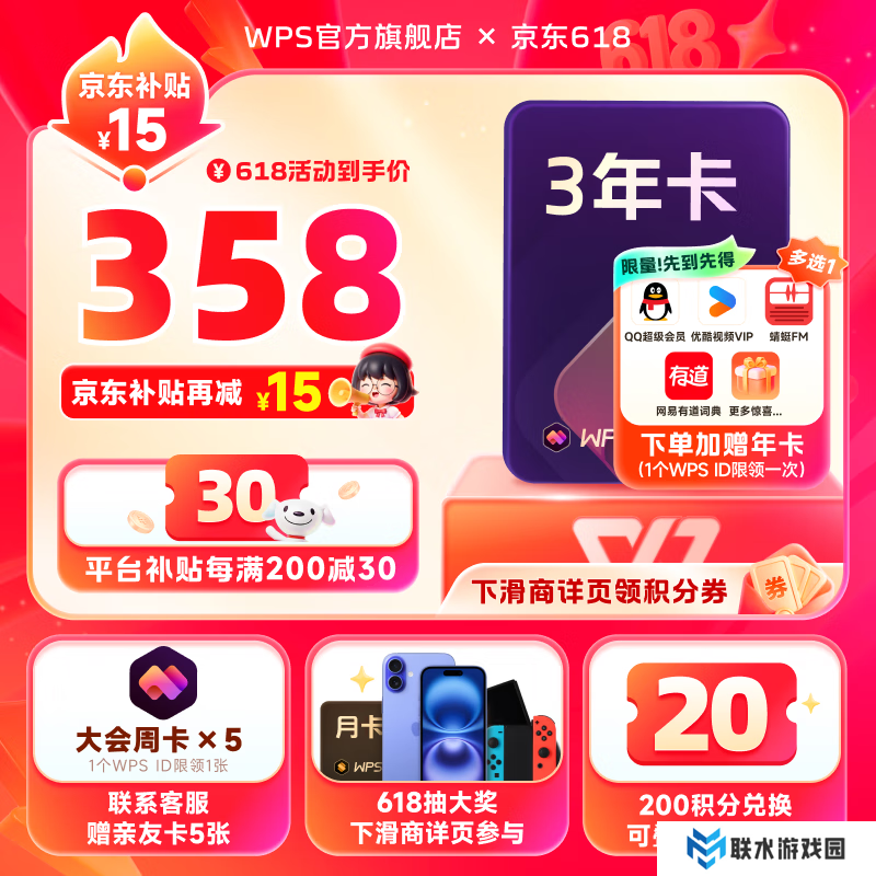 京东WPS 大会员 3 年卡加赠会员 5 选 1 加购物车 1 件领 15 元券