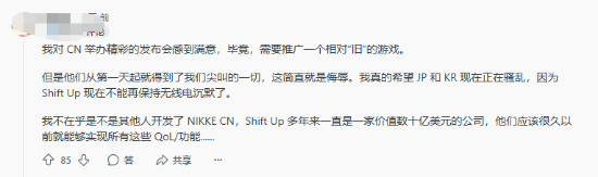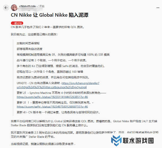 Reddit社区中,很多国外网友抱怨开发商Shift Up偏心,让国际服玩家成了“二等公民”:“国服几乎包含了我们2年来一直要求的所有优化,我看不出任何借口可以解释为什么国际服没有获得这些更改。”