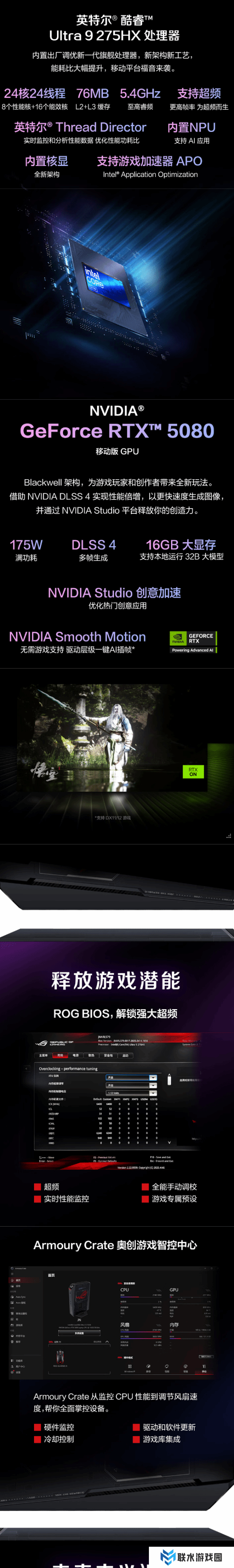 该机搭载 24 核心 24 线程英特尔酷睿 Ultra 9-275HX 处理器和 175W RTX 5080 Laptop 显卡,匹配 32GB DDR5 6400MHz RAM,配备三风扇 + 双 VC 均热板设计,官方称该机搭载专属 BIOS,支持用户自由调节各种参数。