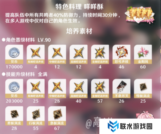 【咩咩酥】:提高队伍中所有共鸣者40%防御力,持续时间30分钟,在多人游戏中仅对自己的角色生效。