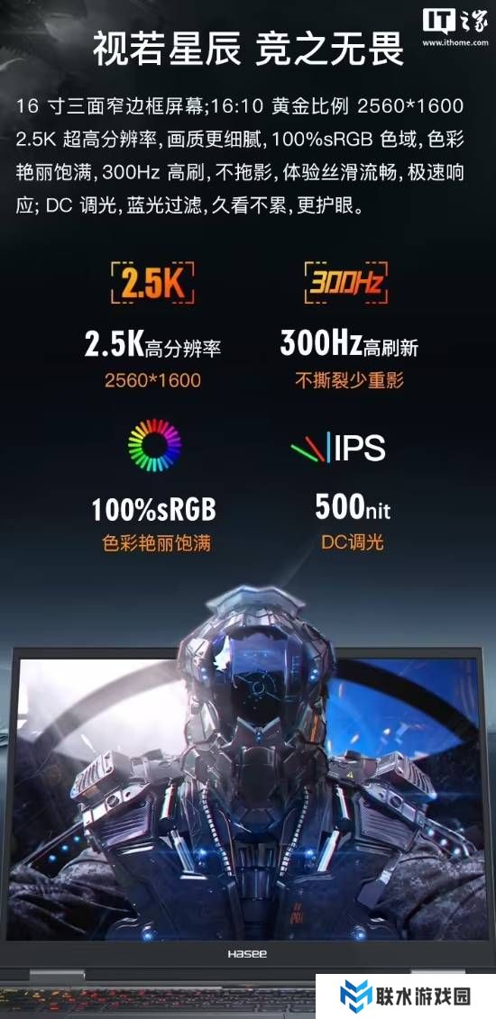 该机整体采用银灰配色,配备全尺寸三区域RGB键盘。机身内置63Wh电池,触摸板支持Windows多指触摸。采用一块16英寸2560x1600分辨率300Hz IPS面板(亮度500尼特)。