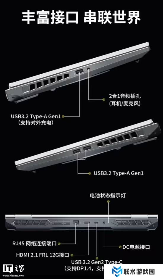 接口方面,该机左侧配备1个USB-A 3.2 Gen 1接口、1个3.5mm音频接口;右侧配备2个USB-A 3.2 Gen 1接口;后侧配备1个RJ45网口、1个HDMI 2.1接口、1个USB-C 3.2 Gen 2接口。