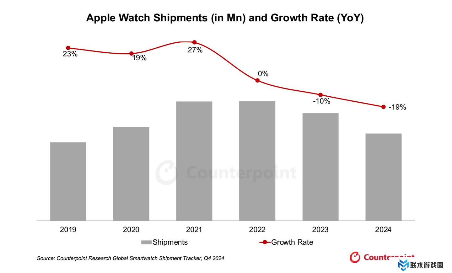 本站 5 月 7 日消息,市场调查机构 CounterPoint Research 昨日(5 月 6 日)发布博文,报道称在 2024 年,苹果 Apple Watch 智能手表出货量同比下降 19%,连续第二年出现负增长。