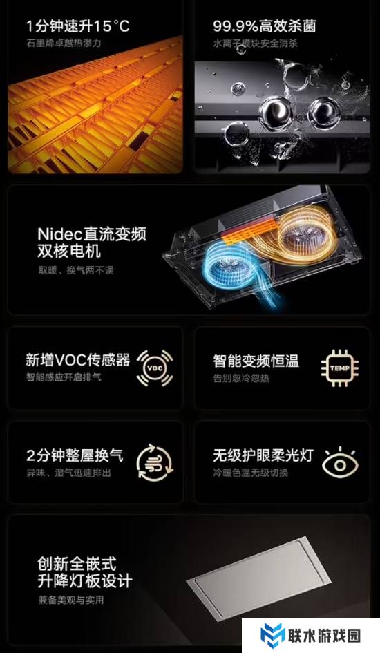 该浴霸配备Nidec品牌电机,每小时换气量254立方米,支持2分钟整屋换气,浴霸同时内置VOC(挥发性有机化合物)传感器,在感应到室内相应化合物超标时将自动开启排气功能,更换浴室空气。