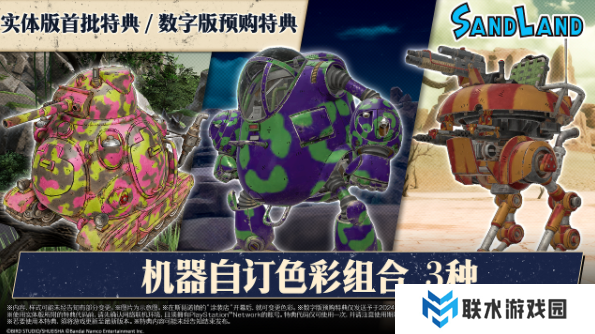 首批购买实体版及预购数字版的玩家将可以获得特典"机器自订色彩组合3种"。玩家将可以涂装于游戏中登场的机器,制作专属于自己的机器。