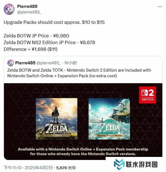 任天堂并未公布这些升级包在不同区域的具体售价。不过在社交媒体上,用户Pierre485计算了根据日本地区的相关售价,认为价格可能在10至15美元之间。不过,这一消息尚未得到官方确认,更多具体定价仍需等待任天堂正式公布。