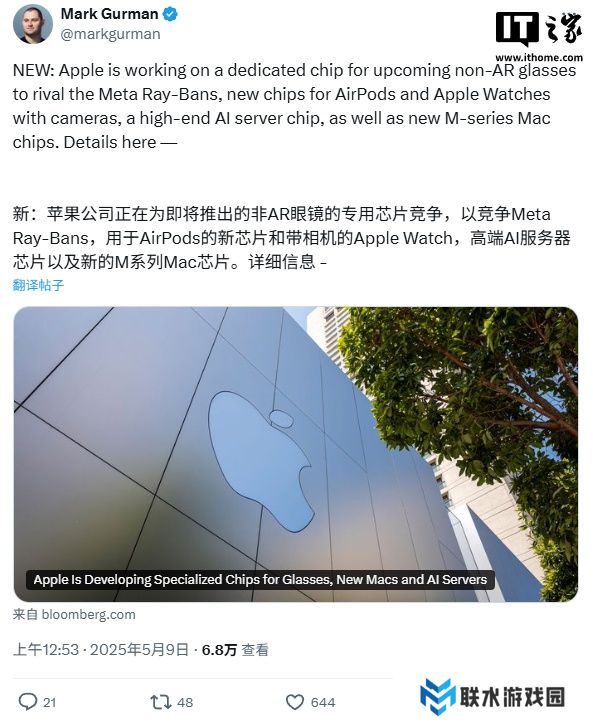 本站 5 月 9 日消息,彭博社马克・古尔曼今日报道称,苹果正在开发一款专为智能眼镜设计的新型芯片,目标在 2026 至 2027 年实现量产,计划未来两年左右推出对应的智能眼镜产品,与 Meta 旗下 Ray-Ban 直接竞争。