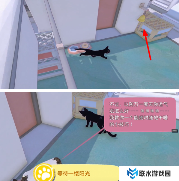 1、午睡动作是在下图位置,先来到下图这个点位,在这里和正在睡觉的小白猫睡觉;