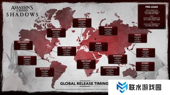 今日,育碧官方正式公布了《刺客信条:影》的全球解锁时间图,Steam、PS5与Xbox Series X|S版本游戏的解锁时间都为北京时间3月20日凌晨0:00,育碧PC商城版本的游戏则提前四个小时解锁,为北京时间3月19日晚上20:00,一起来看下。