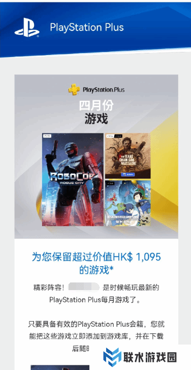 PlayStation官方发布邮件提醒广大用户领取4月一档会免游戏,并着重提及本月的会免游戏价值超过1095港币(约合人民币1034元)。