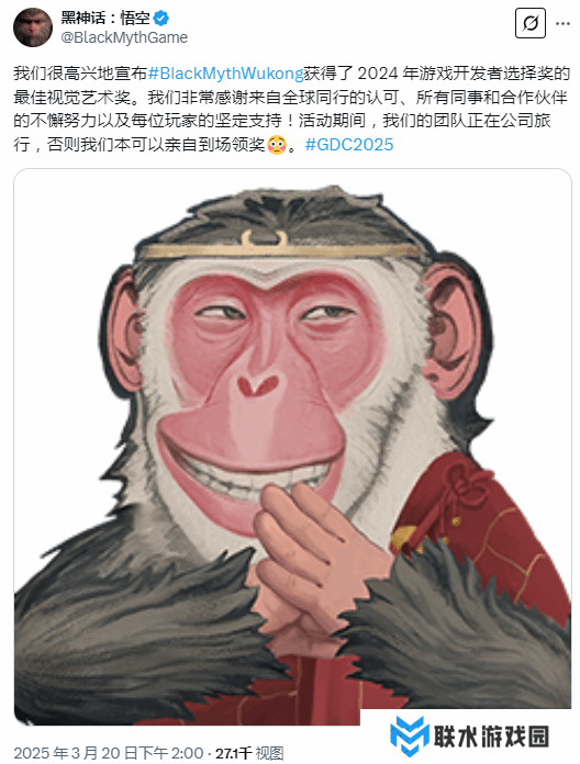 《黑神话》今日获得GDC大奖的最佳视觉艺术奖,但游戏科学并未到场领奖。《黑神话》官推发文表达了获奖的喜悦。