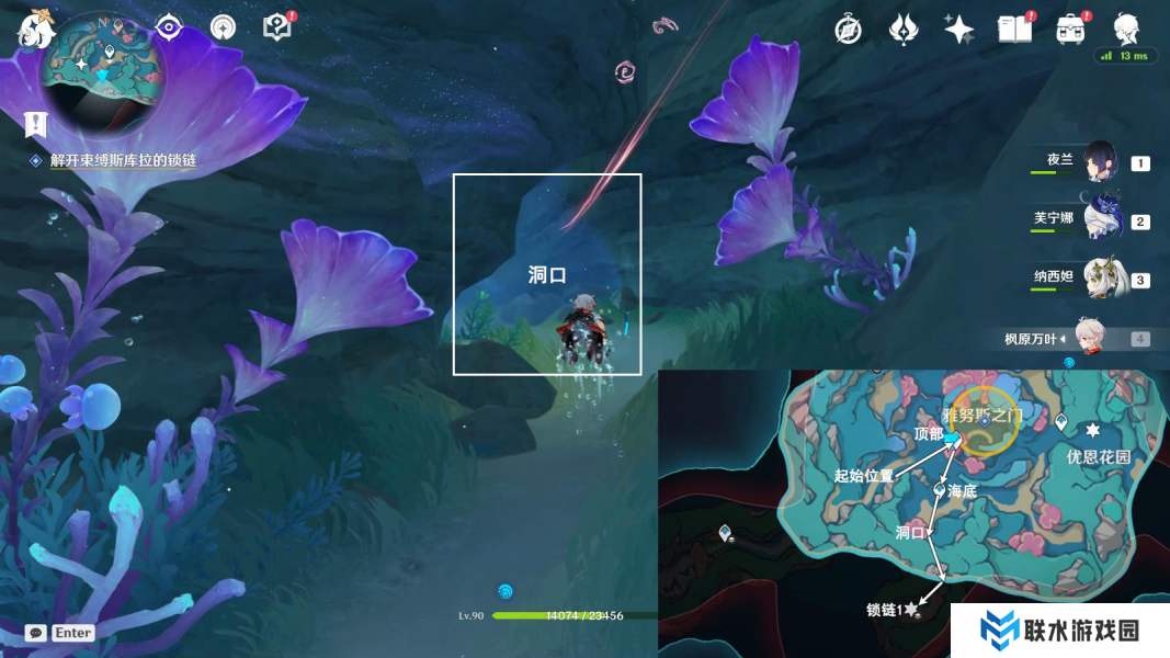 1、按图中指引路线游,开启海底锚点,前往洞口;