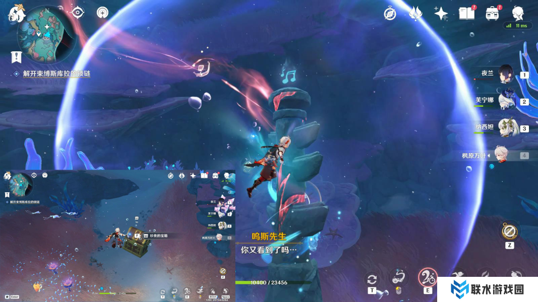 2、靠近螺帽章鱼,待其靠近共鸣海葵(2个都发光)时: