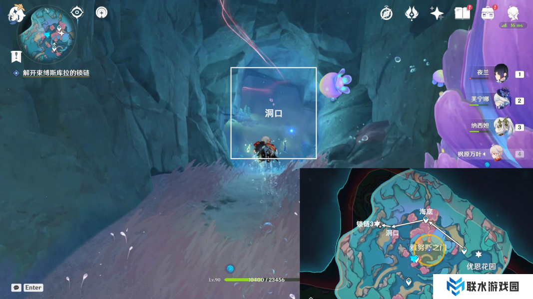 1、按图中指引路线游,开启海底锚点,前往洞口的位置;