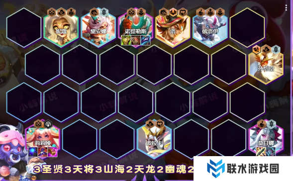 1、阵容组成:妮蔻、索拉卡、戴安娜、泰坦、莉莉娅、莫甘娜、洛、俄洛伊、孙悟空