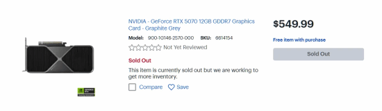 最搞笑的是,在PC Gamer编剧部的一群人围观电商平台百思买上的一块5070时,眼睁睁的看着它从“即将上架”无缝变成了“缺货”……甚至没有给玩家购买的机会。