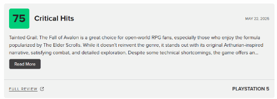 Critical Hits表示:“《污痕圣杯:阿瓦隆的陨落》是开放世界RPG爱好者的绝佳选择,尤其适合喜爱《上古卷轴》系列奠定的经典模式的玩家。虽然这款游戏并未对类型框架进行革新,但它凭借独特的剧情、畅快的战斗体验以及对细节考究的探索脱颖而出。尽管存在一些技术短板,但对于愿意包容其瑕疵的玩家而言,游戏仍能提供一段沉浸感十足且收获丰厚的冒险旅程。”