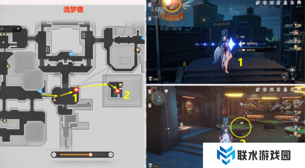 1、玩家要从【流梦礁】下图1位置,坐车【前往天台】2位置:
