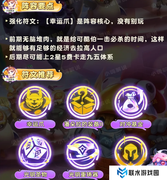 阵容前提:必须要有【幸运爪】,技能造成250%伤害,并且有100%几率掉落1金币(只有最强大的才有,多个可酷伯无效)