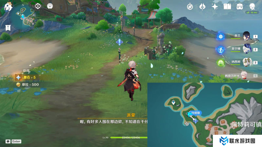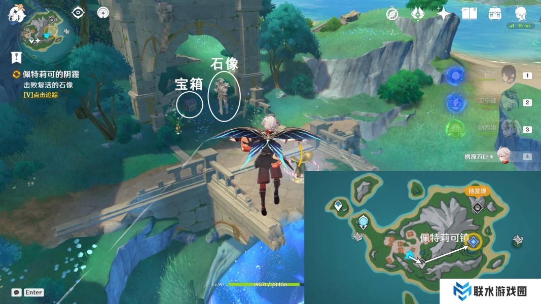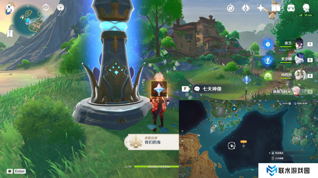 1、首先玩家要传送图中下图的锚点,然后前往开启神像,获得成就「我们的海」;