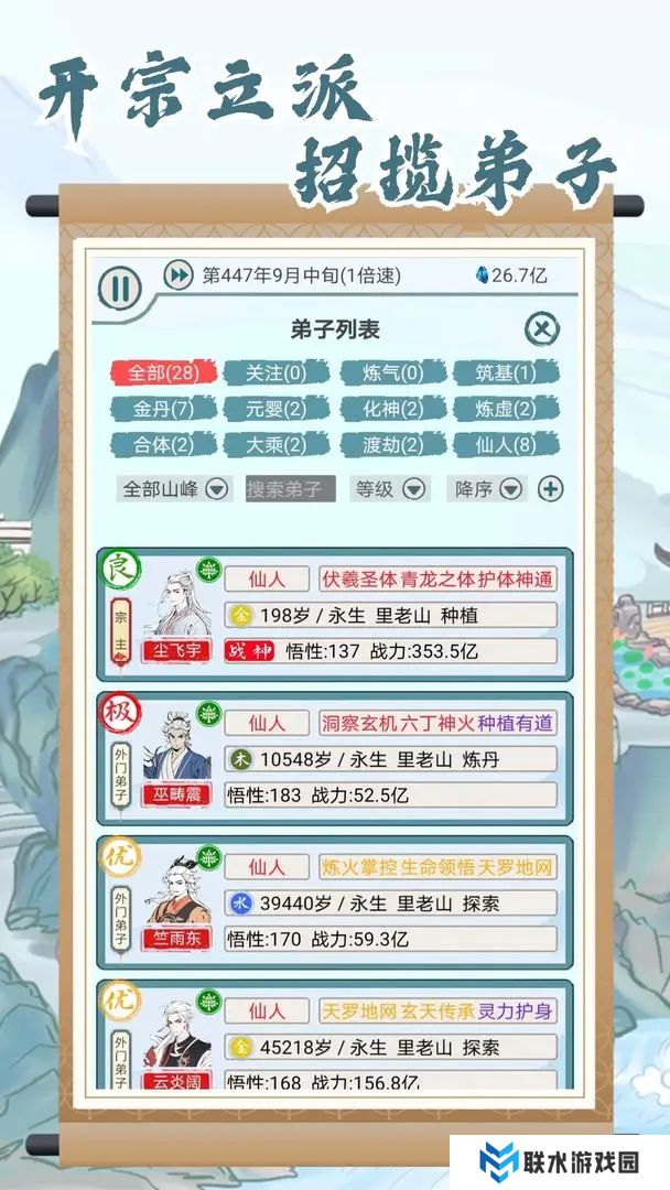 2、游戏提供近百种随机天赋组合,玩家需根据不同弟子的天赋特点进行科学培养。
